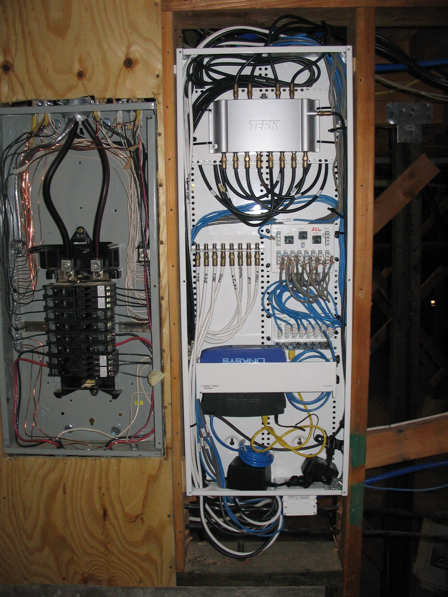 Here is a wall plate that has 5.1 Home Theater local audio, video, network and distributed whole house audio, being terminated in a cabinet. You can see the left, center, right speakers plus the surrounds speakers connected to the wall plates hanging down.